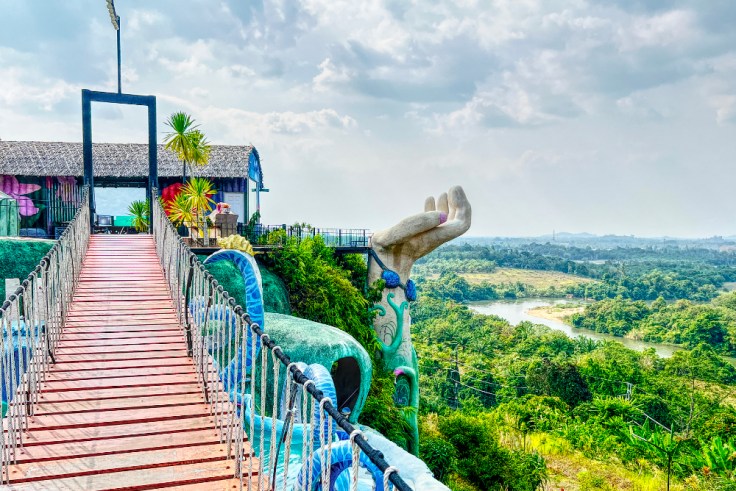 There is a new viewing platform on Bangmara Hill directly opposite the iron bridge at Takua Pa. It belongs to the Dredger Café – and is a somewhat strange mixture of a colorful plaster animal figure park, a café on several floors with a view, suspension bridges and many Instagram photo points. The most famous is the large white hand, but it also has a door to heaven and colorful frames of different colors. You can see the iron bridge from above and also have a good view over the beautiful country. To get up, you pay 60 baht per person at the bottom of the road directly opposite the bridge to walk up about 200 steps (or a little more if they drive you up). Part of the entry fee is deducted when you buy drinks in the café upstairs. The drinks are fine, the view is good.