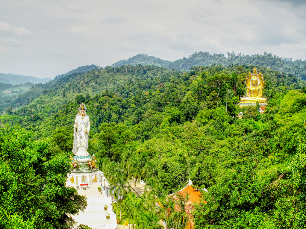 Der Tempel wird auch Wat Rat Upatam genannt und besteht aus mehreren Teilen: eine großflächige Tempelanlage am Fuß eines Hügels und Tempel und Statuen etwas verteilt oben auf dem Hügel. Eines der Tempelgebäude unten ist in Form eines Schiffes inmitten eines künstlichen kleinen Sees angelegt. Die Anlage oben auf den Hügeln kombiniert drei verschiedene Tempel-Stile: Thai, Chinesisch und eine Chedi Pagode. Eine große sitzende Buddha Statue blickt über das Land, die (chinesische) Göttin des Mitgefühls schaut daneben in die Ferne und in einem Schrein wird ein Zahn von Buddha aufbewahrt. Ein Besuch im sehr pompösen Tempel mit dem Chedi ist mit entsprechend anständiger Bekleidung möglich (ansonsten kann man Überkleider hier kaufen) und kostet nur 20 Baht. Der Tempel liegt ziemlich weit im Landesinnern, 40 km nördlich von Phang Nga.