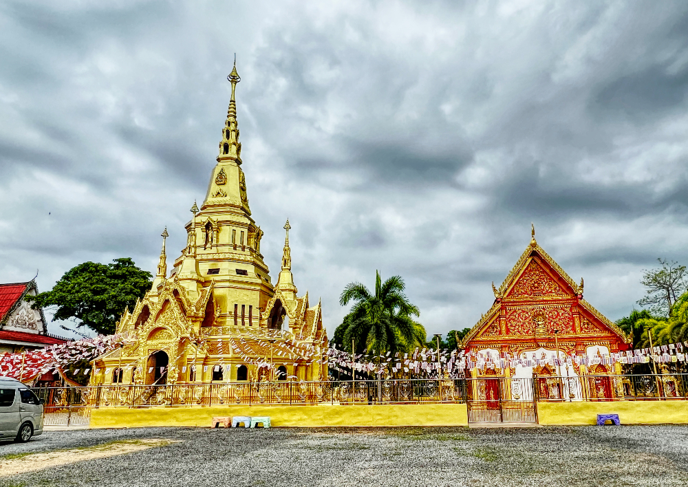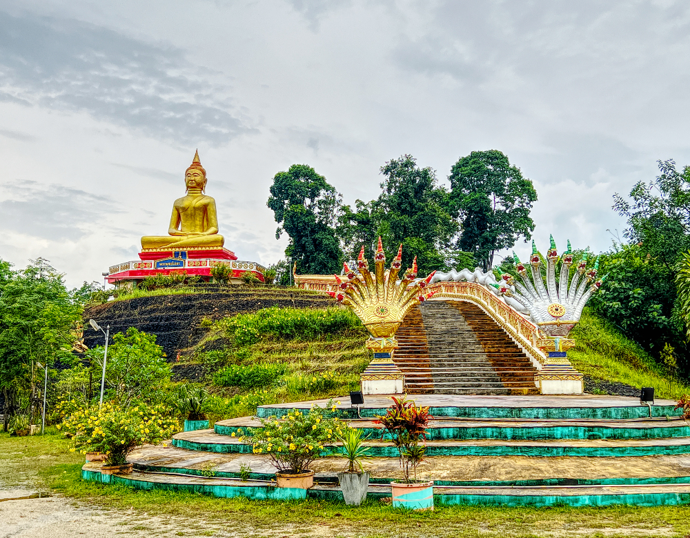 Die Klosteranlage mit dem großen goldenen Buddha liegt an der 4005, der Straße zwischen Khao Lak (Abzweiger beim Sai Rung Wasserfall) und der Alststadt von Takua Pa. Der Buddha und die zu ihm führende Treppe wurde 2018 neu erbaut und bis 2021 fertig errichtet. Sehr eindrücklich ist die Nagatreppe mit den mehrköpfigen Schlangen, die links in Gold, die rechts in Perlmuttweiß. Von der Plattform oben hat man eine nette Aussicht in das hügelige bewaldete Hinterland.