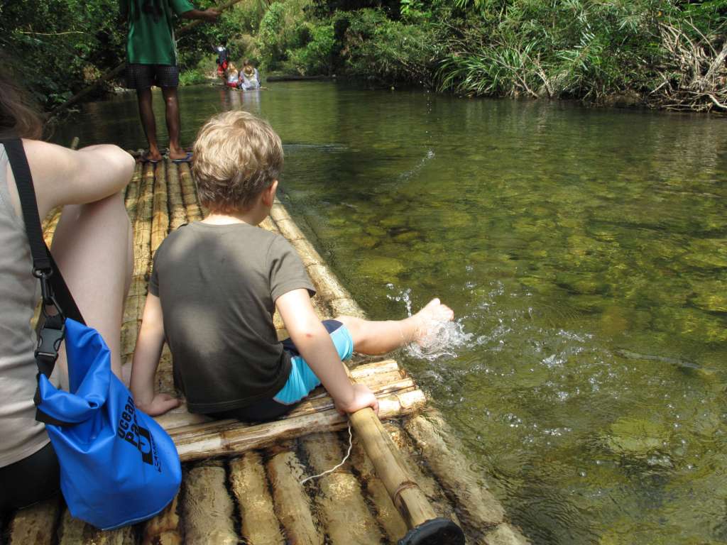 Auf dem Bambussfloss wird man durch den Führer mittels einem Stab durch die Stromschnellen flussabwärts gelenkt. Es ist (trotzdem) eine eher gemütliche Fahrt mit schönen Aussichten in die Umgebung vom eher seichten Flüsschen aus. In der Trockenzeit kann es sein, dass der Wasserstand dafür zu niedrig ist. Badehose mitnehmen und geniessen!