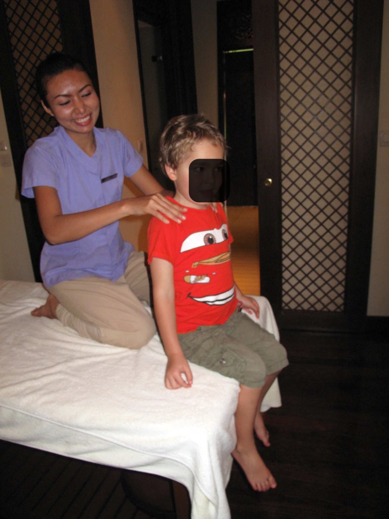 Auch Kinder können schon Massagen bekommen – entsprechend angepasst, also sehr viel sanfter als die Erwachsenen. Vorher fragen, ob sie Erfahrung damit haben und ab welchem Alter. Unserem hat es sehr gefallen, auch wenn er hier (beim ersten Mal) noch etwas unsicher dreinschaut.