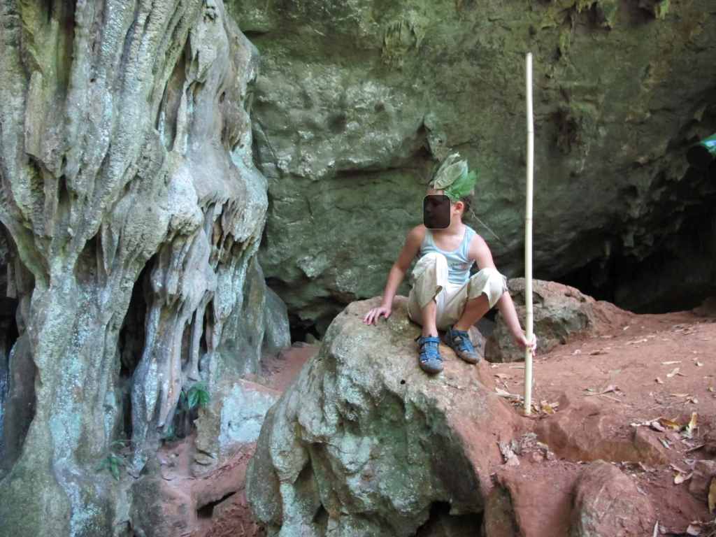 Im Khao Sok gibt es sehr schöne und auch nicht so lange Wanderwege zu Aussichtspunkten und Höhlen. Viele starten vom Cheow Lan Lake aus. Hier Junior bei einem Höhlenbesuch – gut ausgerüstet mit Wanderstab und Dschungel-Krone.