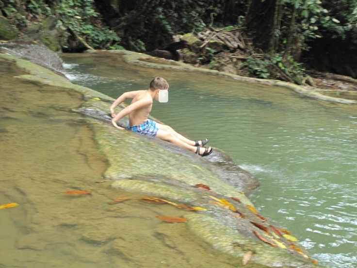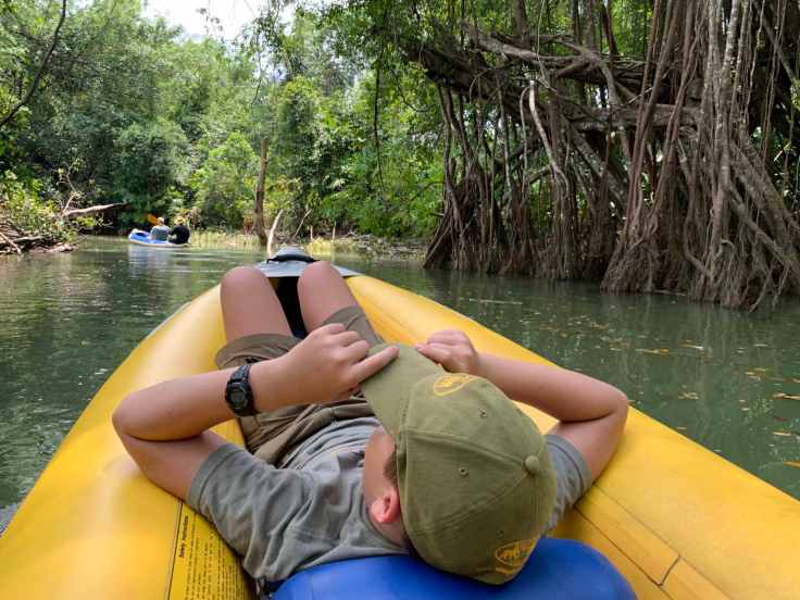 When you go bamboo rafting, the guide uses a stick to steer you down the rapids. It is (nevertheless) a rather leisurely ride with beautiful views of the surroundings from the rather shallow river. In the dry season, the water level may be too low for this. Bring your bathing suit and enjoy!