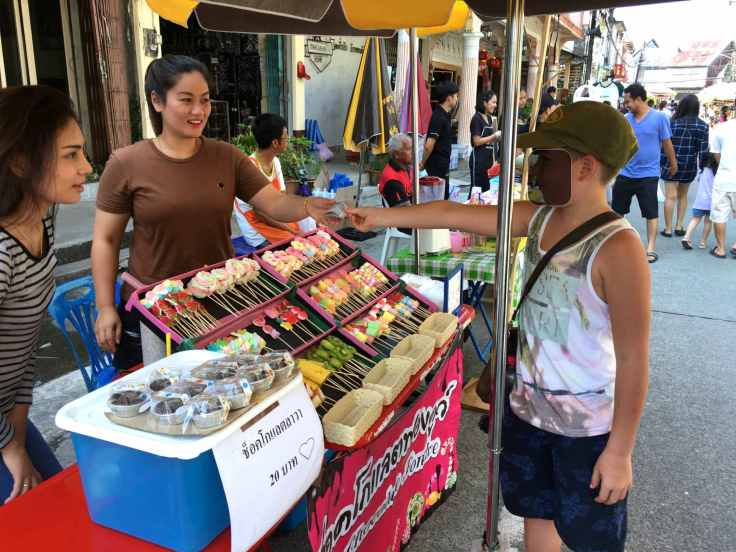 In the main season (now also outside of it) a historic street market takes place every Sunday afternoon in the old town of Takua Pa, which is also visited by tourist tours. But you can also book excursions yourself or make them yourself – any taxi can take you there. It’s well worth strolling through and sampling some unusual snacks and seeing artisans making batik or punching the delicate shadow figures out of cowhide. There are few other souvenirs to buy and the food is too good to take it home.