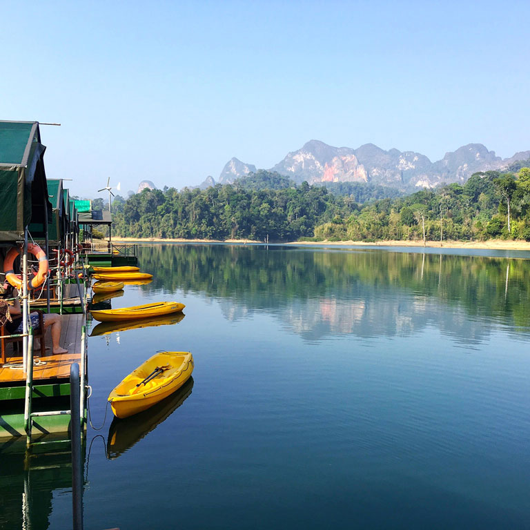 Relaxen auf dem See: Cheow Lan Lake übernachten auf dem Wasser in einem der schwimmenden Bungalows. Ein einmalig schönes Erlebnis das man bei einem Besuch im Khao Sok Nationalpark mit Übernachtung hat.