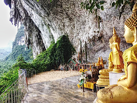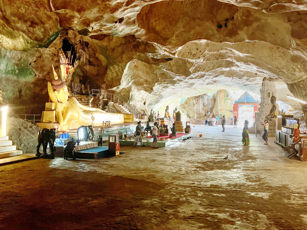 Oder Wat Suwannakuha oder auch Wat Tham, auch bekannt als „der Tempel mit dem großen Buddha in der Höhle“. Der Tempel mit Höhle liegt bei Phang Nga. Viele Touren und Touristen besuchen ihn, weshalb sich eine ganze Infrastruktur von kleinen Shops auf dem Parkplatz gebildet hat – und so viele Affen, dass sie gelegentlich auch Monkey Cave genannt wird. Der Eingang zur Höhle mit dem grossen, liegenden Buddha ist auf der rechten Seite des Parkplatzes durch ein schön (blau) angemaltes Tor (man zahlt Eintritt). Im hinteren Teil der Höhle führt eine Treppe nach oben (und außen). Folgt man ihr kommt man auf ein Plateau, von dem aus links wiederum eine Treppe nach unten in eine hübsche Tropfsteinhöhle führt.
